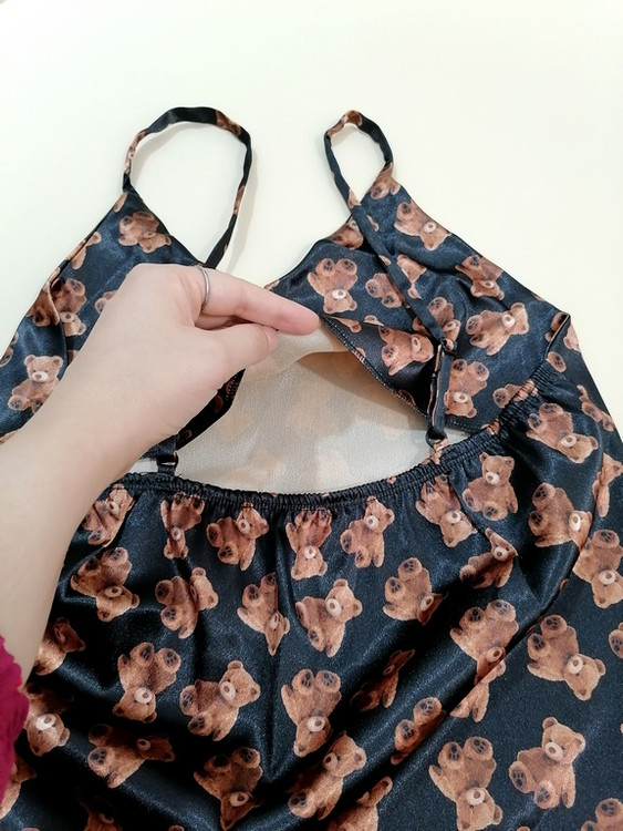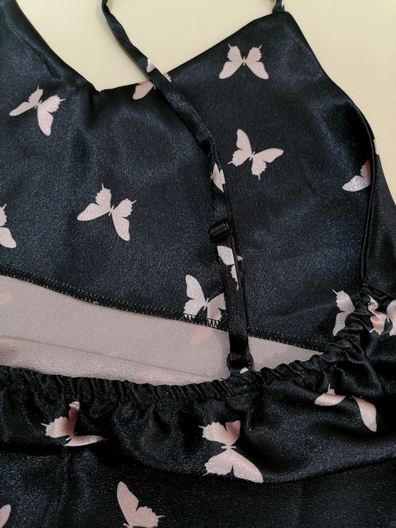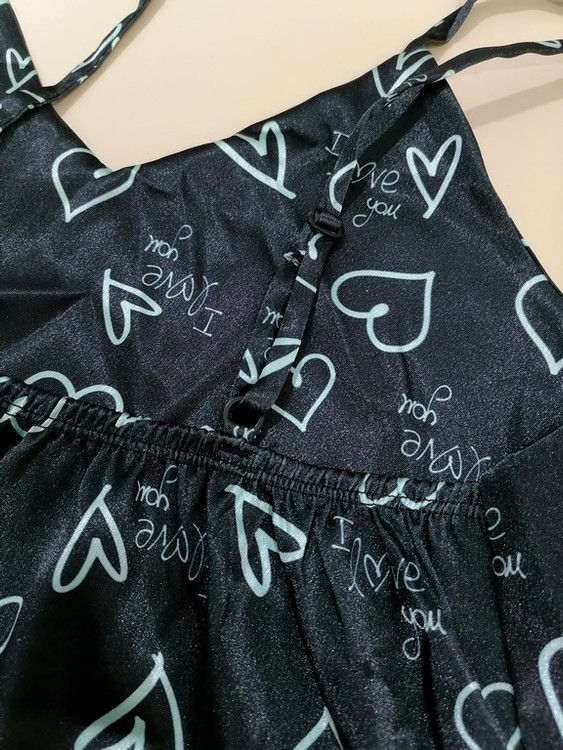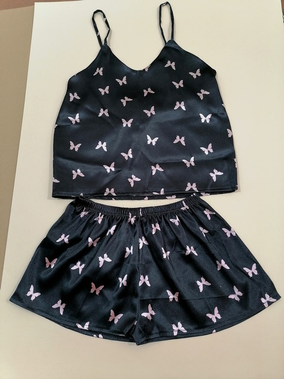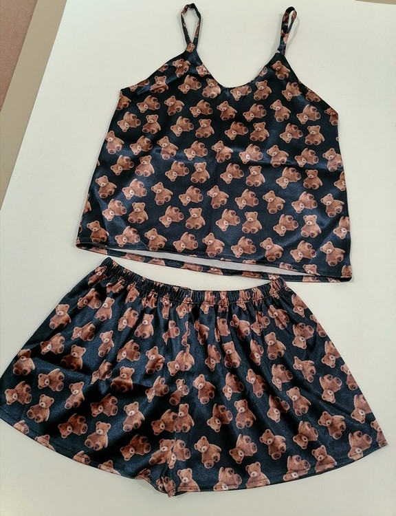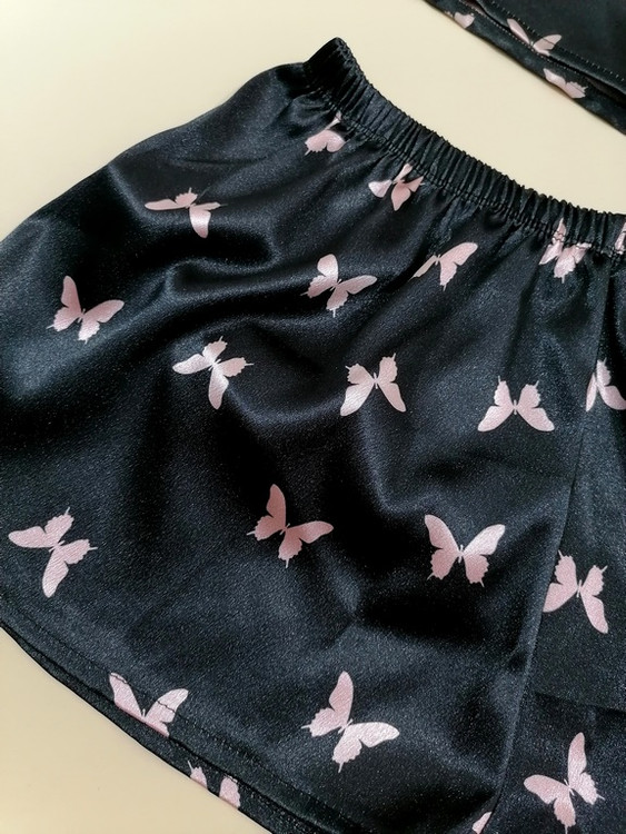 ست تاپ و شورتک ساتن طرحدار گرم بالا و عالی و زمینه تمام طرحاش مشکیه